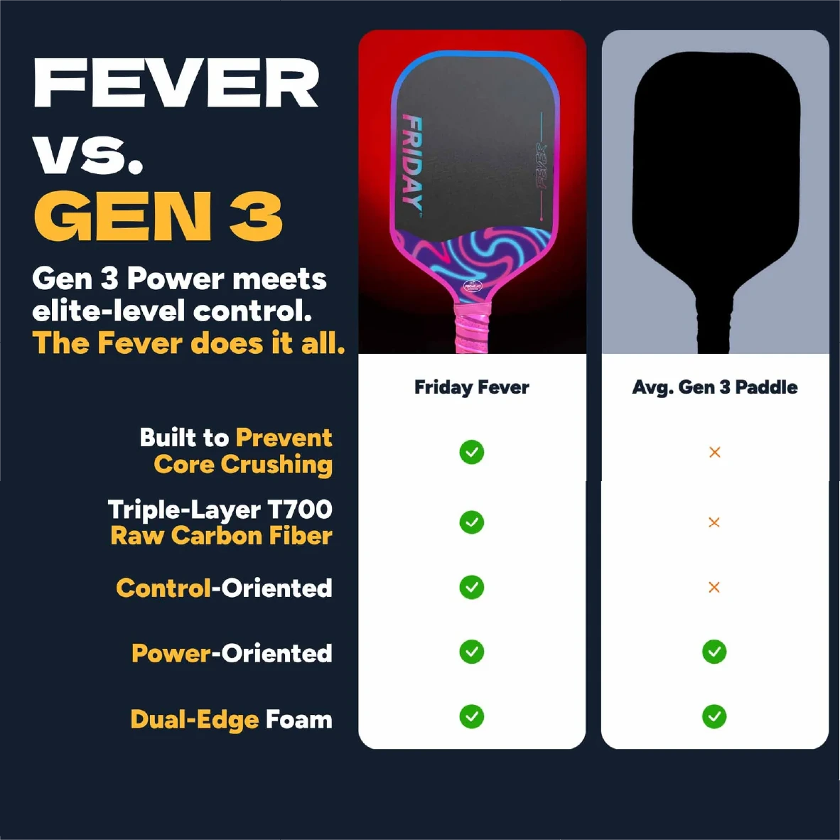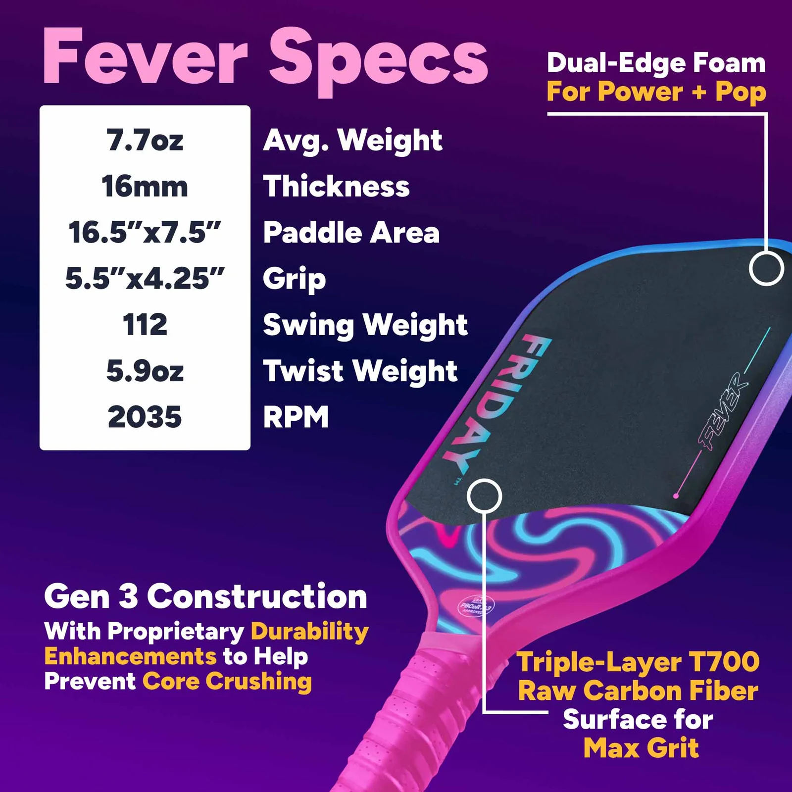 The Gen 3 durability enhancements strengthen the paddle structure and help prevent core crushing, improving long-term paddle performance.